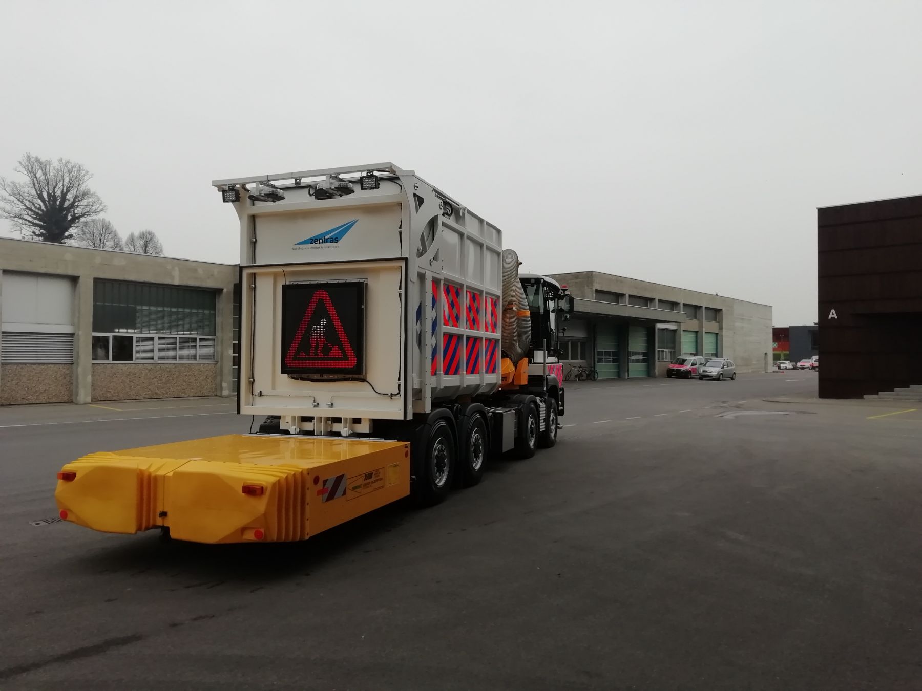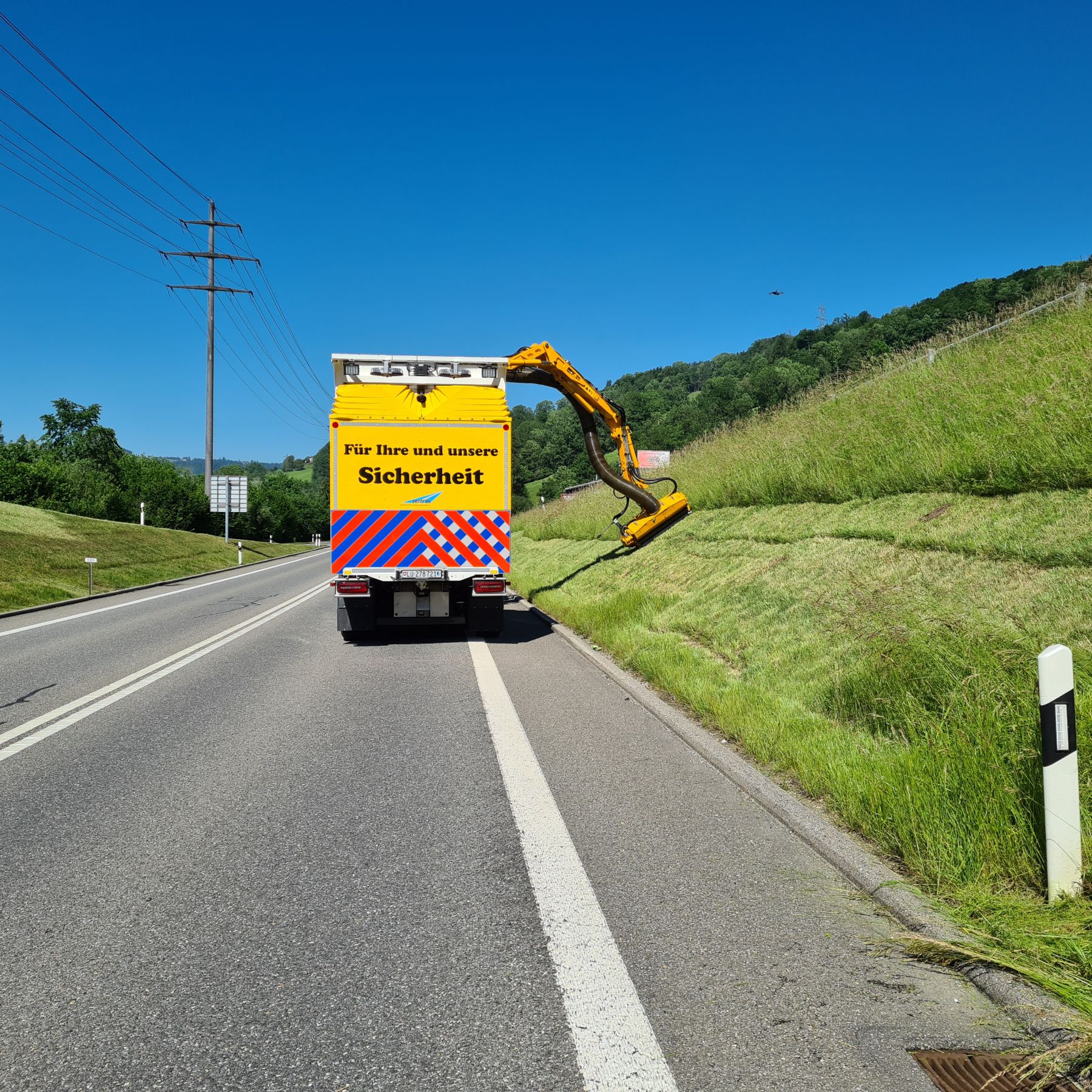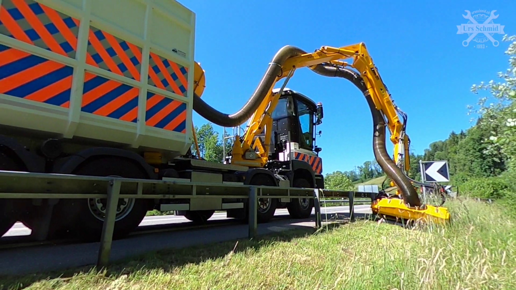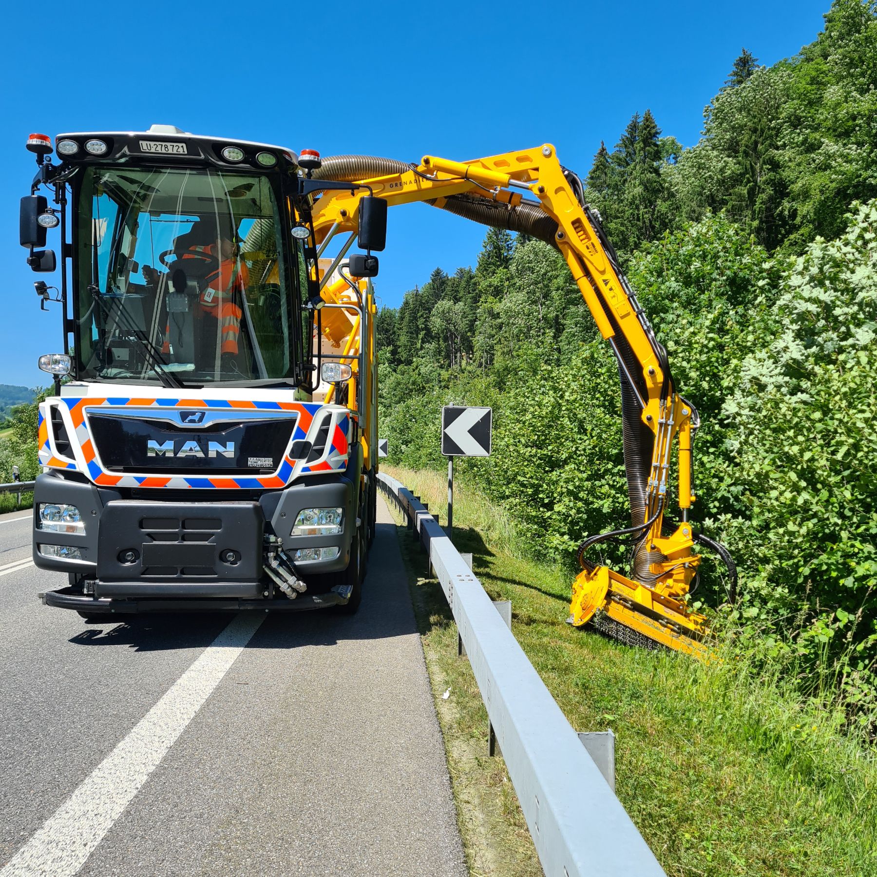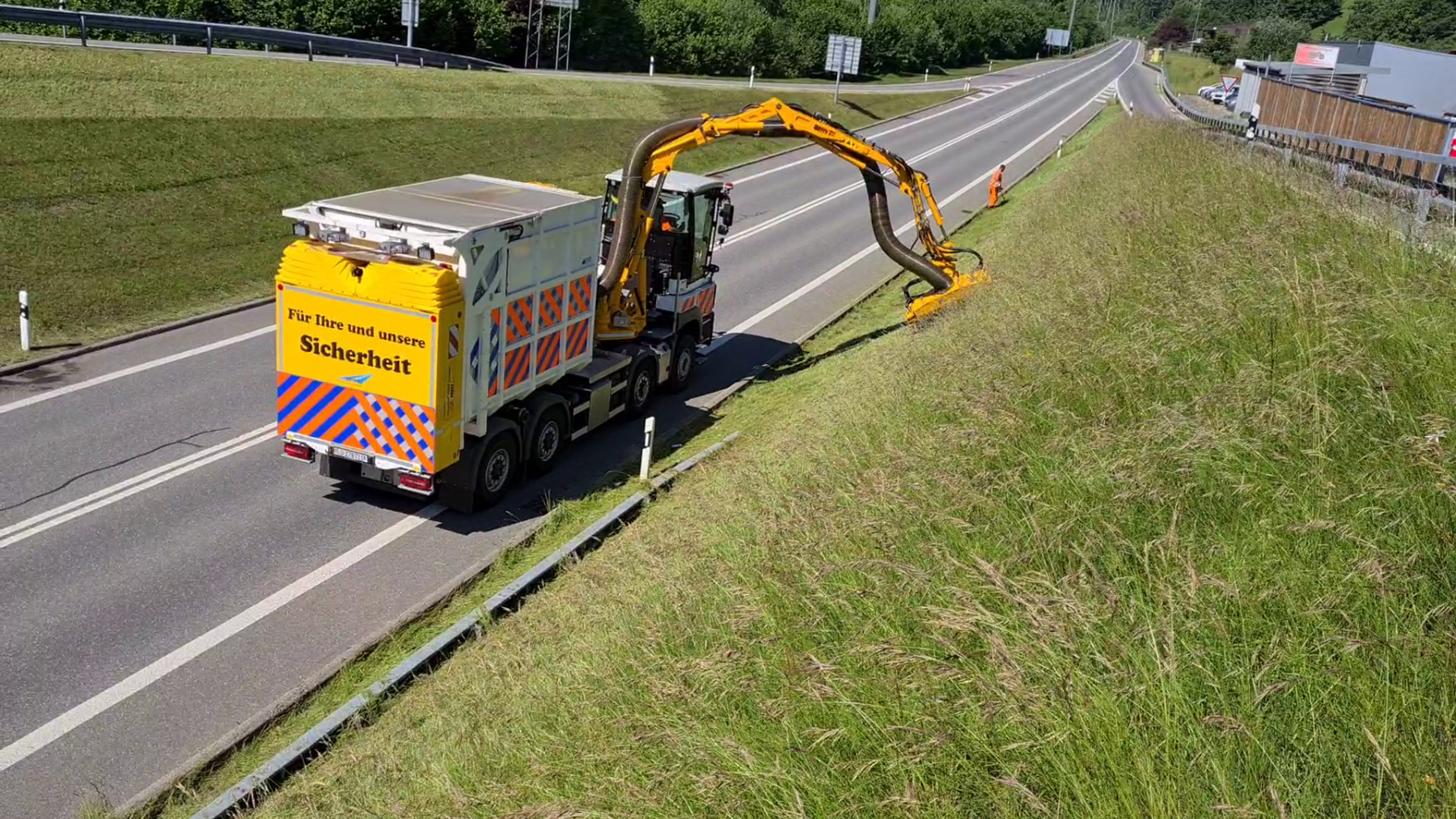 der durch die Toni Maurer GmbH auf 2,30m Fahrzeugbreite umgebaute MAN erlaubt das Mähen von Autobahnböschungen auf dem Pannenstreifen, ohne dass eine Spur gesperrt werden muss.